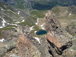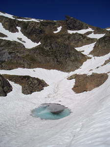 Au refuge de Pombie, un panonceau indique la direction du col de Peyreget et le sentier qui y mène est bien tracé au dessus du lac dont la transparence des eaux laisse encore voir une barque coulée que la vase a commencé à effacer. Bientôt, le manteau de neige se fait plus continu. Un groupe monté avant nous a fort opportunément fait de bonnes traces ce qui nous permet d’atteindre sans trop de fatigue le col. En suivant la crête sur la gauche, nous finissons de monter jusqu’au sommet en dominant le vallon que nous venons de parcourir. Les eaux topaze d’un petit lac, reste de l’hiver passé, dessinent un cœur sur leur écrin de neige. A l’opposé, vers le Nord, la vue s’élargit progressivement.